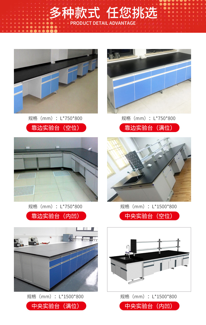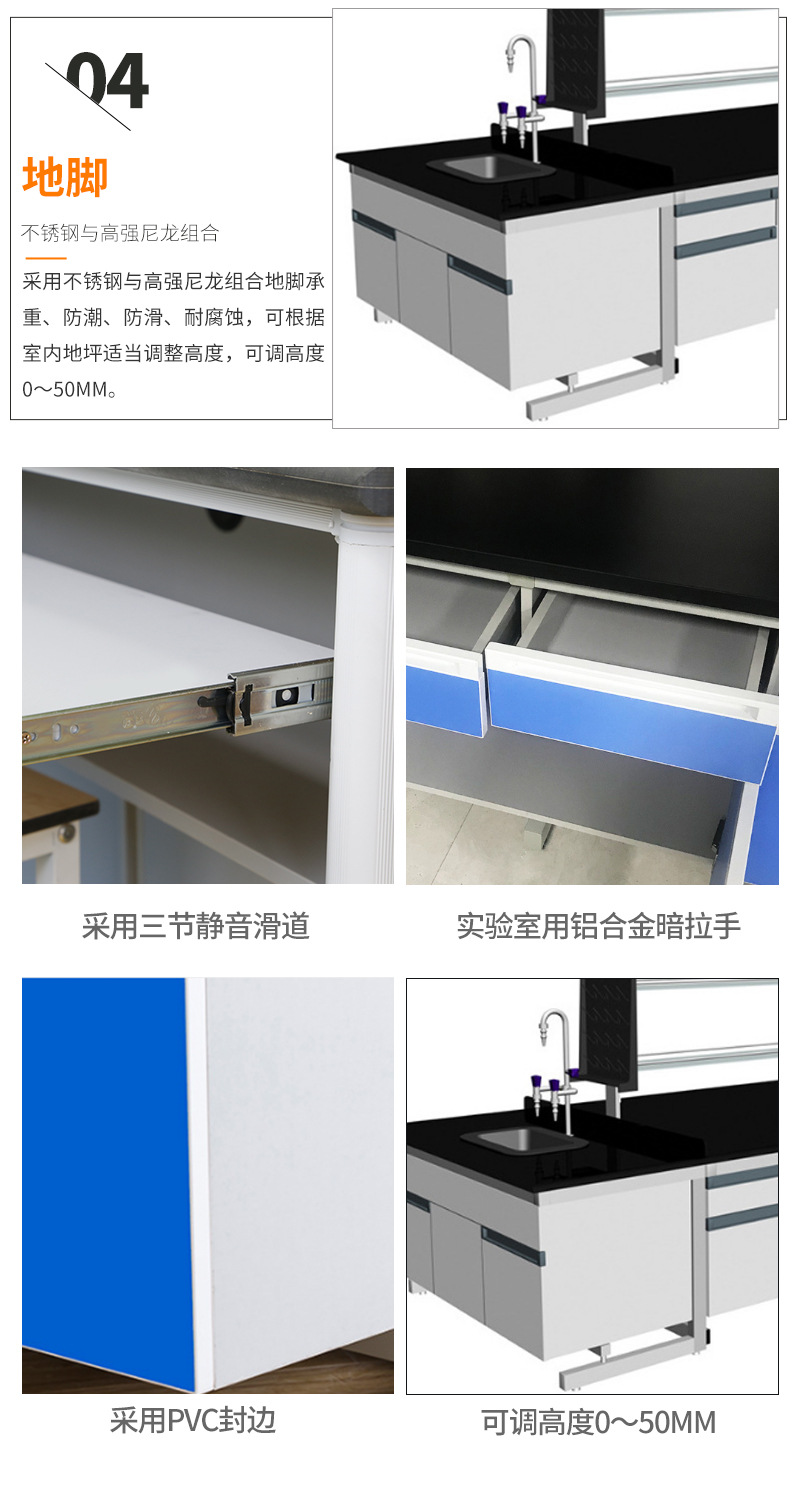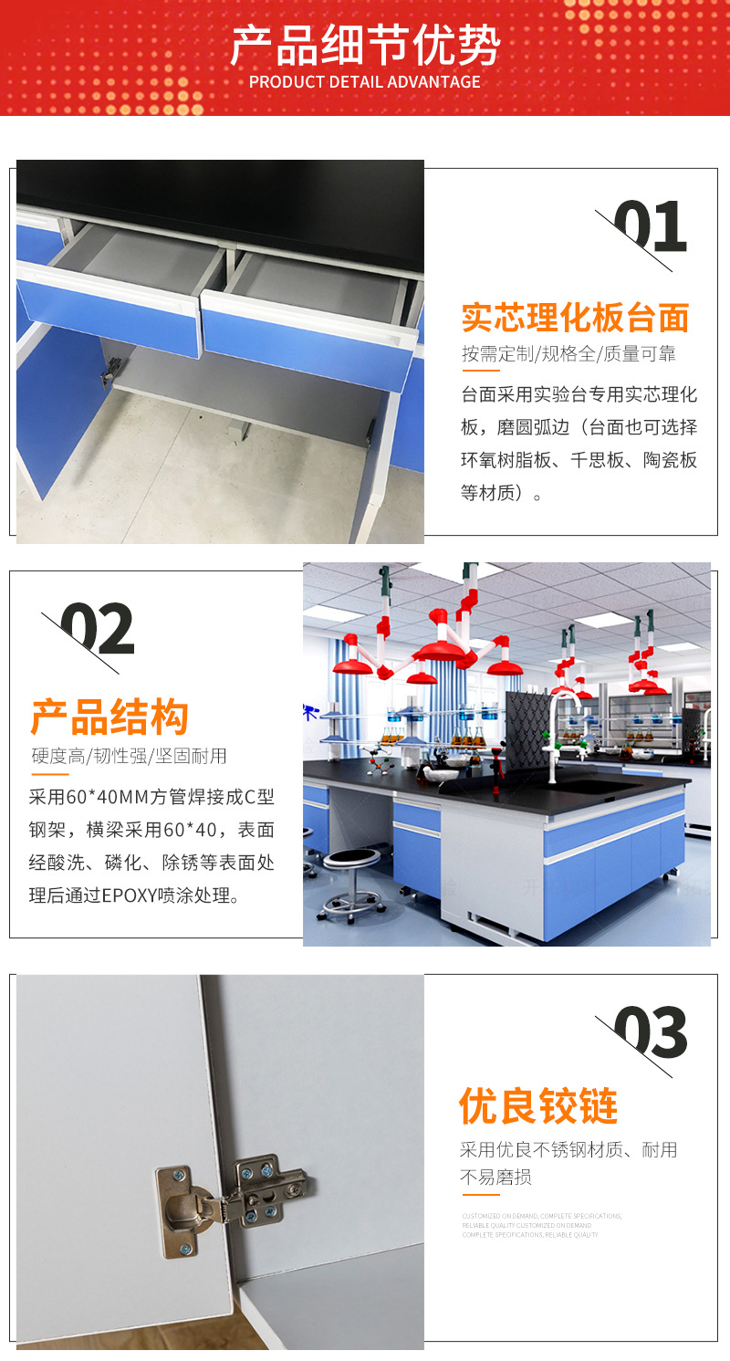 臺(tái)面:采用實(shí)驗(yàn)臺(tái)專(zhuān)用實(shí)芯理化板,磨圓弧邊(臺(tái)面也可選擇環(huán)氧樹(shù)脂板、千思板、陶瓷板等材質(zhì))。 結(jié)構(gòu):采用60*40mm方管焊接成C型鋼架,表面經(jīng)酸洗、磷化、除銹等處理后通過(guò)EPOXY噴涂