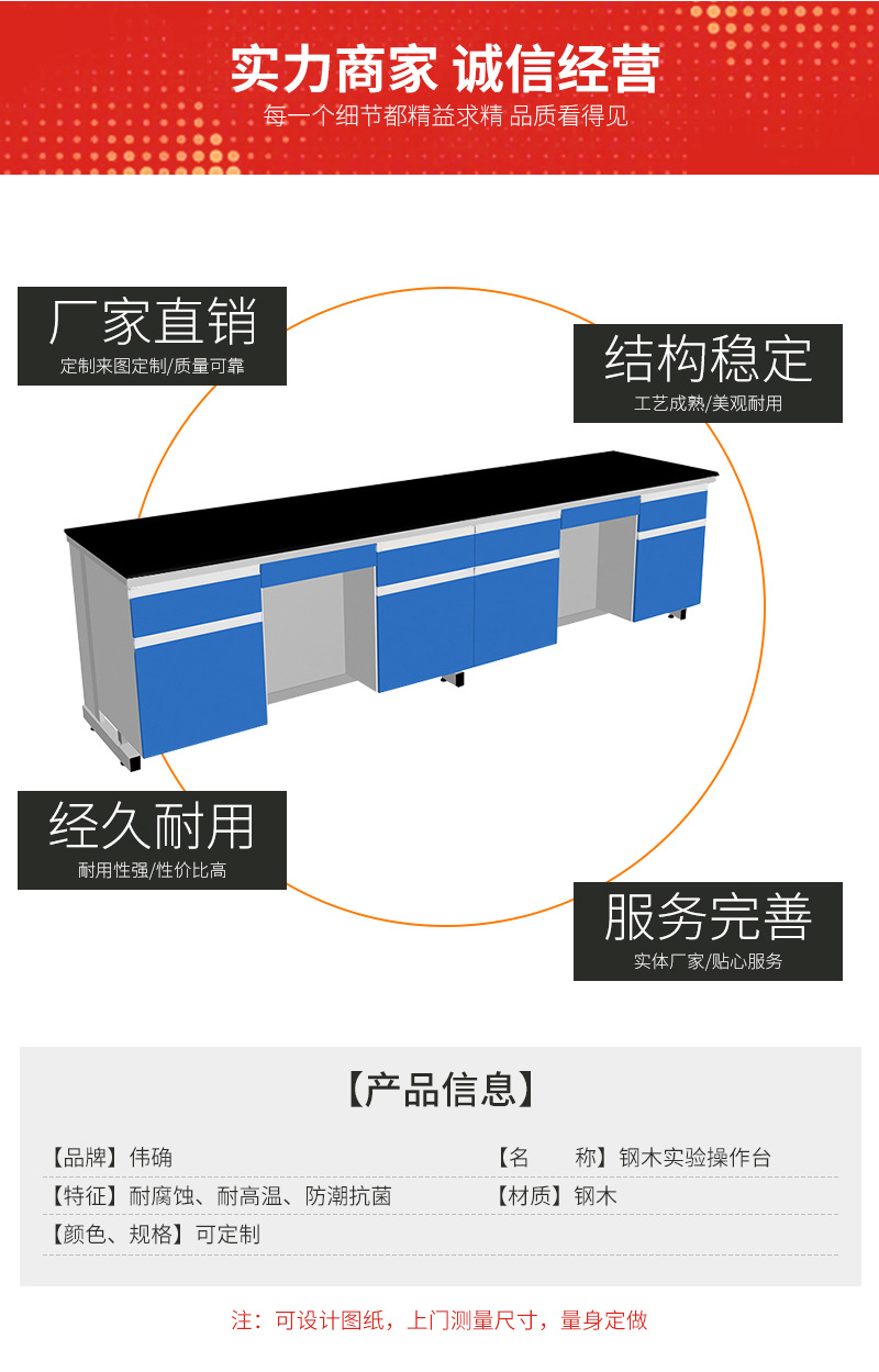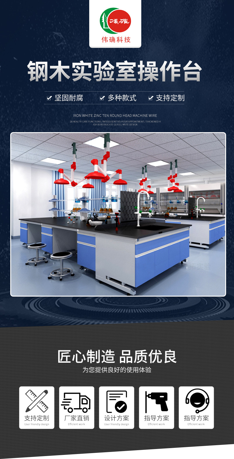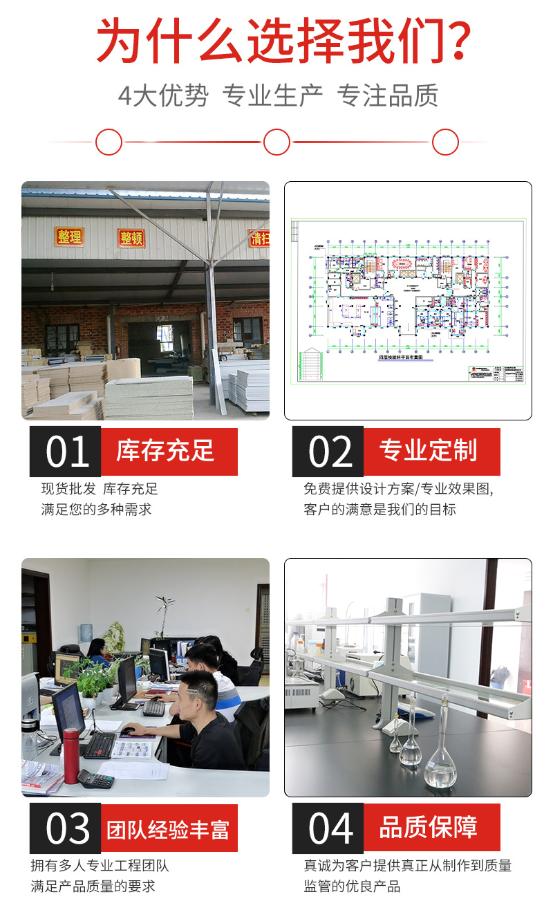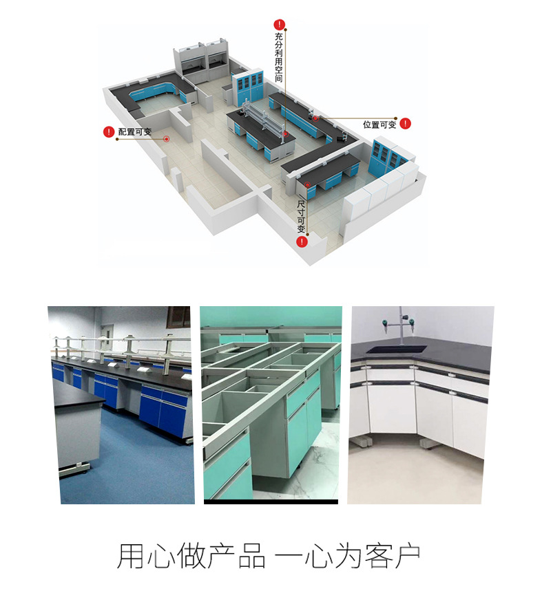 臺(tái)面:采用實(shí)驗(yàn)臺(tái)專(zhuān)用實(shí)芯理化板,磨圓弧邊(臺(tái)面也可選擇環(huán)氧樹(shù)脂板、千思板、陶瓷板等材質(zhì))。 結(jié)構(gòu):采用60*40mm方管焊接成C型鋼架,表面經(jīng)酸洗、磷化、除銹等處理后通過(guò)EPOXY噴涂