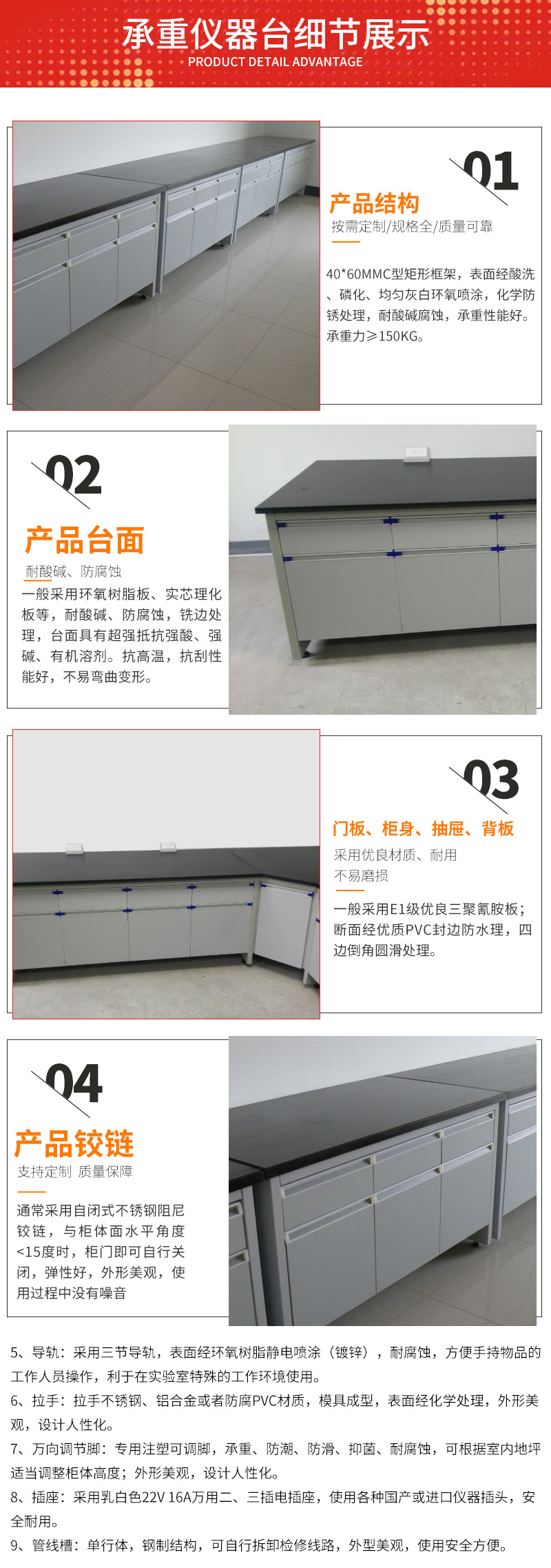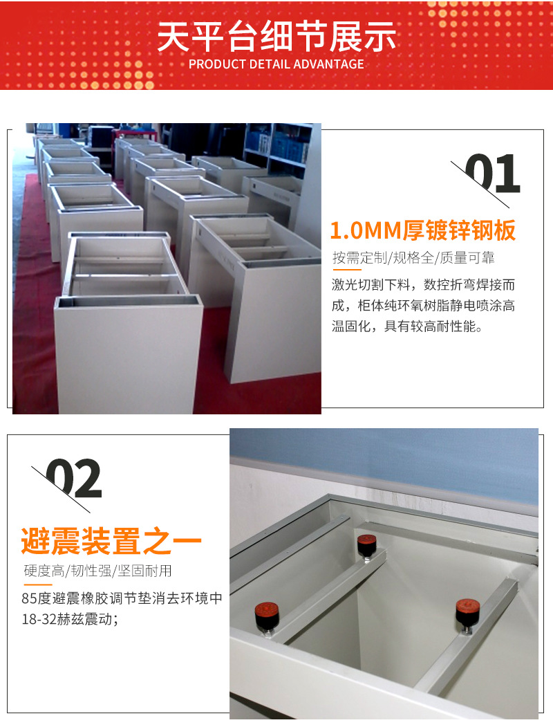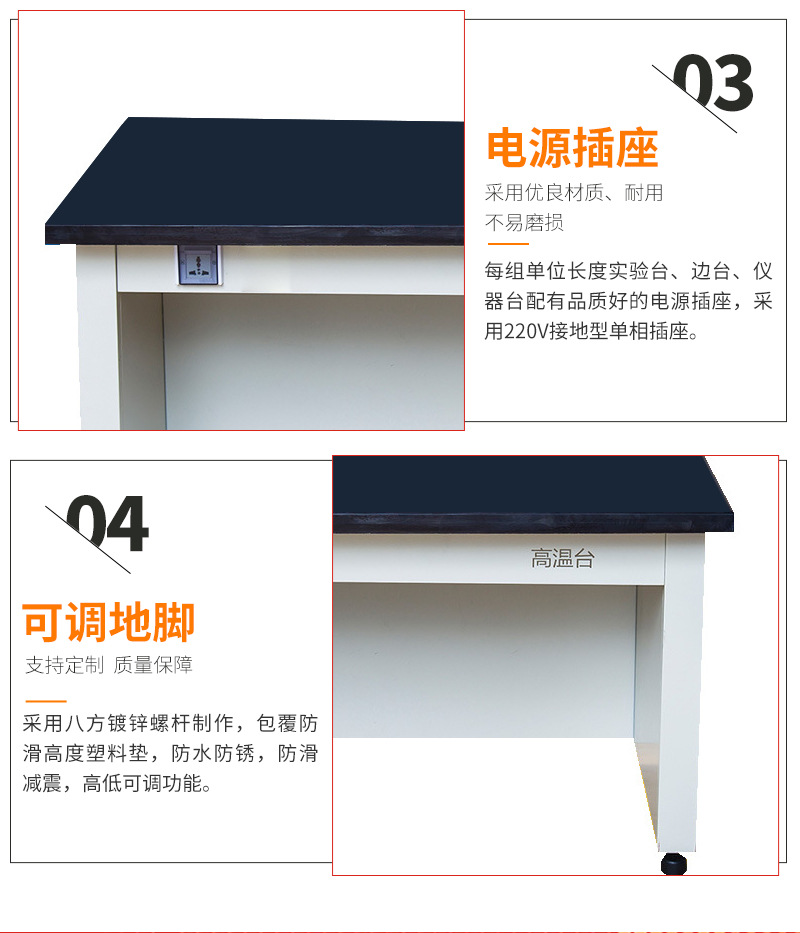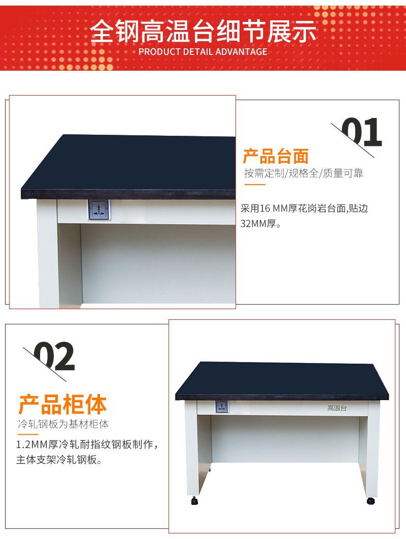 柜體:柜體采用0.8m厚鍍鋅鋼板折邊焊接而成,采用純環(huán)氧樹(shù)脂靜電噴涂高溫固化,具有較高耐蝕性能。 臺(tái)面:工作臺(tái)面分為兩部分,采用12.7實(shí)心板及60MM厚花崗巖臺(tái)面。 電源:10A多功能防濺